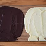 Pół tabliczki białej i czarnej czekolady rozpuszczamy osobno w kąpieli wodnej.