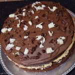 Pierwszą część umieszczamy na paterze, nasączamy, następnie smarujemy kremem czekoladowym i opruszamy batonikami.